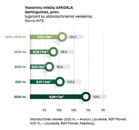Veislės ūkinio vertingumo tyrimai, atlikti 2020 ir 2021 m. Plungės, Kauno, Pasvalio ir Utenos AVT skyriuose. Veislės tyrimo metais gautas vidutinis 8,08 t ha-1 grūdų derlius. Didžiausias ‘Amidala’ derlius buvo išaugintas 2020 m. Pasvalio AVT skyriuje – 10,6 t ha-1. Viena iš nedaugelio salyklinių miežių veislių, turinčių aukštą salyklo įvertinimą tiek Vokietijos „Berlin Program“ tiek „CBMO“ Prancūzijos salyklinių miežių augintojų komiteto. 2023–2024 m. Vokietijoje didžiausi sėklinių miežių plotai buvo apsėti ‘Amidala’ veislės sėklomis. Labai stambūs grūdai. Veislė labai atspari miltligei, atspari tinkliškajai dryžligei, rūdims, rinchosporiozei, vidutiniškai