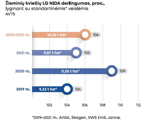 Veislės ūkinio vertingumo tyrimai atlikti 2019-2021 m., gautas vidutinis derlingumas 10,25 t ha-1 arba 106 proc. lyginant su standartinėmis veislėmis. Didžiausias derlius buvo gautas 2020 m. Pasvalio AVT skyriuje 13.00 t ha-1.2022 m. privačiuose veislių bandymuose derlingumas buvo 103 proc. lyginant su standartinėmis veislėmis. Geras atsparumas ligoms.
