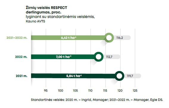 Atskirais tyrimo metais išaugintuose ‘Respect’ veislės žirnių grūduose nustatytas vidutinis baltymų kiekis sudarė 22,0–25,1 proc.